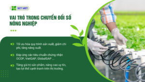 * Đóng vai trò quan trọng trong chuyển đổi số Nông nghiệp nhằm Tối ưu hóa quy trình sản xuất, giảm chi phí, tăng năng suất. Đáp ứng các tiêu chuẩn chứng nhận như OCOP, VietGAP, GlobalGAP … Tăng giá trị sản phẩm, nâng cao uy tín, tạo lợi thế cạnh tranh trên thị trường.